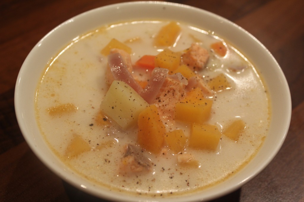 Päätimme käyttää keitossa aika perinteisiä raaka-aineita ja mausteita. Tämä ei siis ole aasialainen kalakeitto, vaan lähempänä perinteistä versiota. Kookoksen kanssa kannattaa käyttää yhtä tai kahta makeampaa juuresta, kuten bataattia, lanttua, porkkanaa tai palsternakkaa. Muuten mennään ihan perinteisellä linjalla.