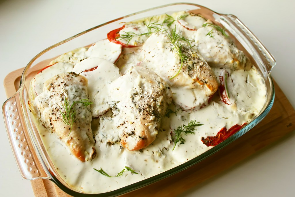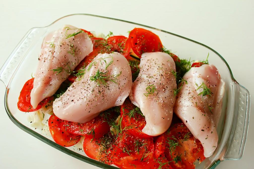 3. Hiero broilerin pintaan kevyesti suolaa ja pippuria ja pane fileet kasvispedille. Paista vuokaa ensin ilman foliota 175-180 asteessa noin vartin verran, jotta kasvikset ja broileri saavat väriä. Peitä vuoka tämän jälkeen foliolla ja paista vielä reilut 40 minuuttia, kunnes broileri on kypsää. Parhaan lopputuloksen saat, kun lasket hieman uunin lämpötilaa ja hauduttelet pataa miedommalla lämmöllä yli tunnin. Jos kasviksista ei irtoa tarpeeksi nestettä, lisää joukkoon tilkka vettä, jotta vuoka ei kuivahda.