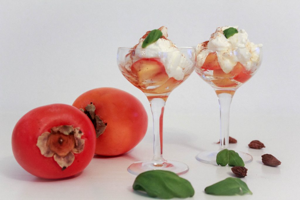 Lohko jälkiruokamaljojen pohjalle yksi persimon. Vaahdota 1 desi kermaa ja sekoita vaahdon joukkoon 100 grammaa pehmeää vuohenjuustoa. Aseta hedelmäkuutioiden päälle vaahtohuppu. Koristele ripauksella kanelia ja hunajasilmällä tai murskatulla pistaasipähkinällä. Helppoa kuin tukinuitto nälkävuosina.