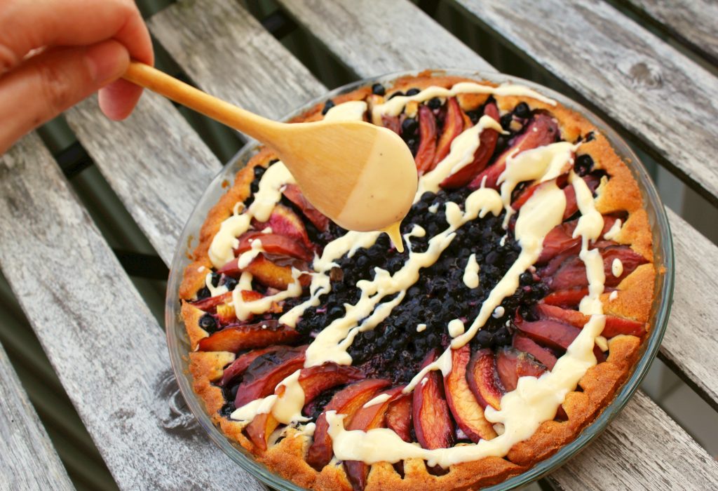 Tämä mustikka-nektariinipiirakka muuttuu kätevästi sesonkiruoaksi, kun korvaat nektariinin persimonilla. Makean, kullanoranssin hedelmän ja raikkaiden, sinisten mustikoiden yhdistelmä on harmoninen ja visuaalisesti nätti. Päälle vielä kasa paksua vaniljakastiketta ja torttusi näyttää ihan Suomen lipulta (sori, shitti läppä, mutta oli vaan pakko saada sanoo).