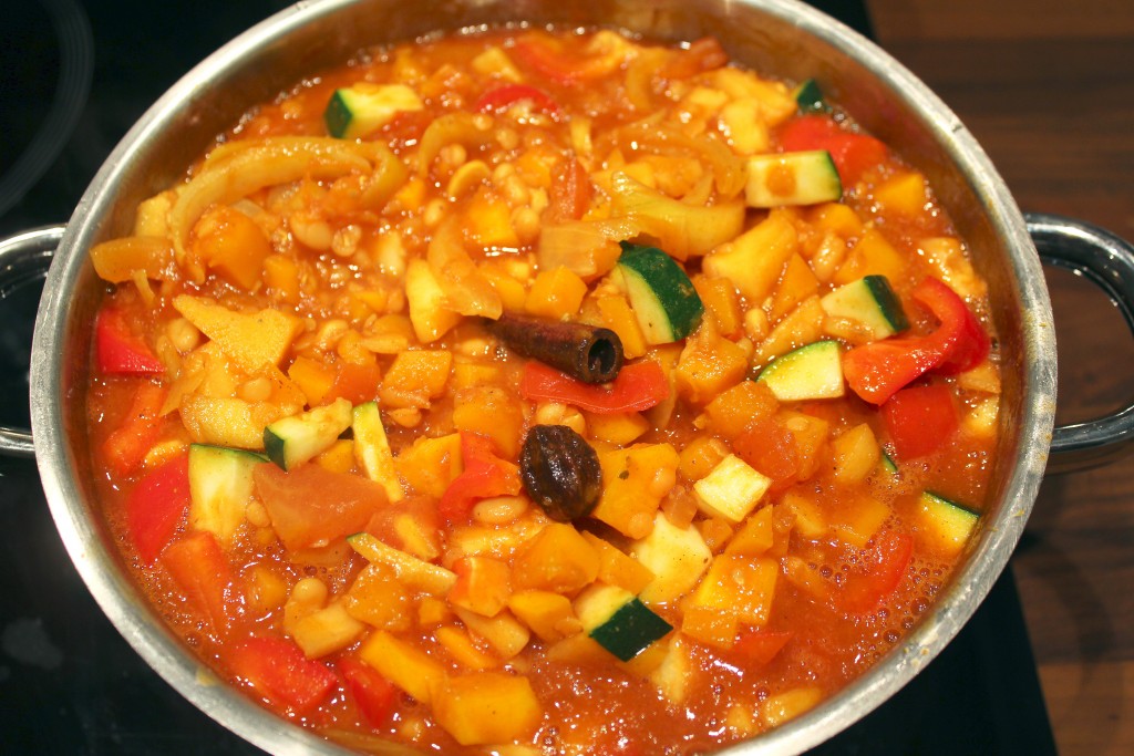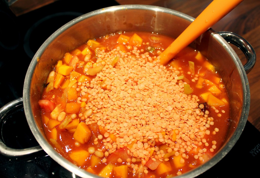2. Pese ja lohko kurpitsat ja paprikat, ja kuori ja lohko omenat. Huuhdo pavut lävikössä. Kaada kasvikset kattilaan mausteseoksen joukkoon. Lisää tomaattimurska, pavut, linssit ja sen verran vettä, että kasvikset peittyvät.