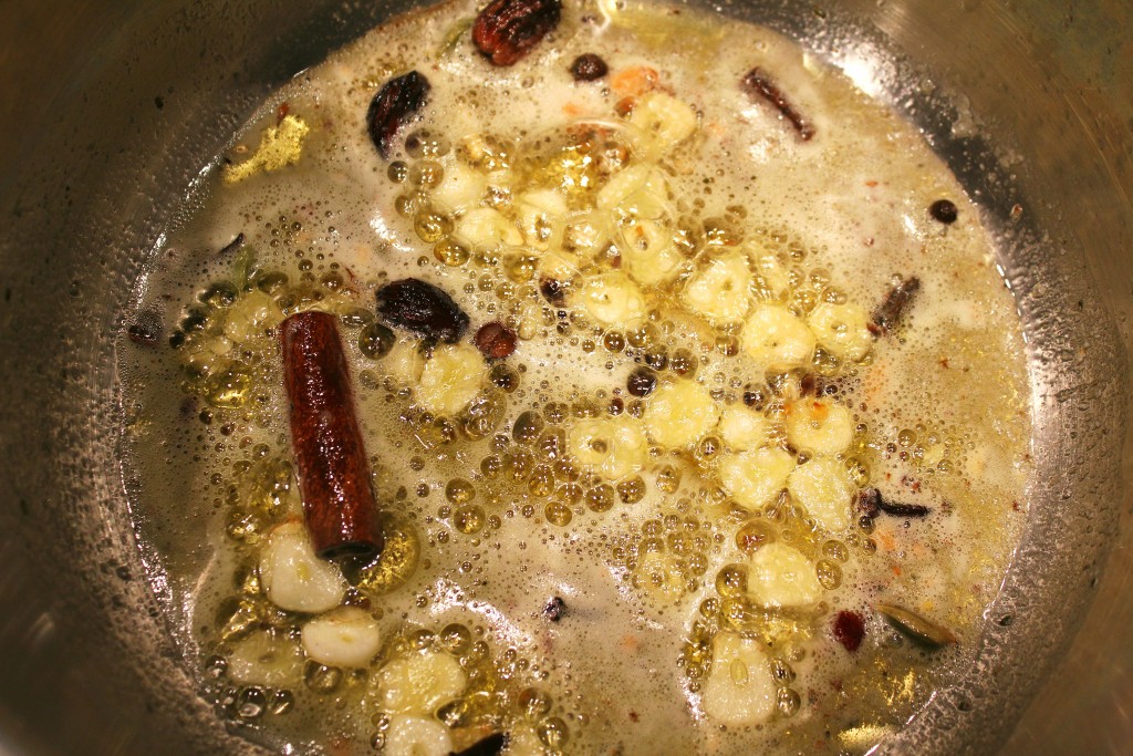 1. Painele kardemummiin veitsen kärjellä reikiä, jotta mausteen aromit pääsevät imeytymään. Kuori ja paloittele valko- ja keltasipuli. Kuumenna kattilassa loraus öljyä ja suuri nokare voita. Kaada rasvan joukkoon mausteet ja sipulit. Kuullota viitisen minuuttia miedolla lämmöllä ja varo, ettei valkosipuli pala.