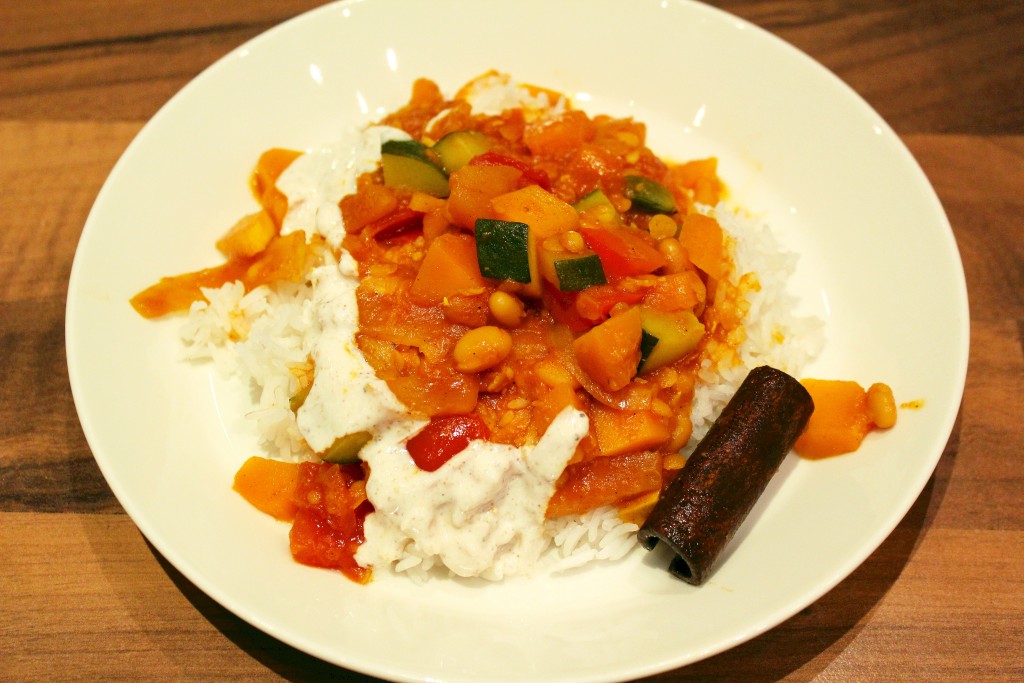 Teimme currya todella ison kattilallisen, joten jos tarpeesi ovat pienemmät, voit puolittaa annoksen. Sen lisäksi, että currya tuli paljon, siitä tuli todella tuhtia. Minulle on tärkeää, että kasvisruoassa on kunnolla proteiinia. Laitoimme kastikkeeseen punaisia linssejä, jotka antavat siihen sakeutta, ja lisäksi valkoisia papuja sattumiksi. Curryssa voi käyttää melkein mitä tahansa kurpitsoja, paitsi spagettikurpitsaa, jonka rakenne ei sovi tähän. Makuerot eivät ole valtavia, mutta eri väristen kurpitsojen käyttäminen tekee kastikkeesta pirtsakan.