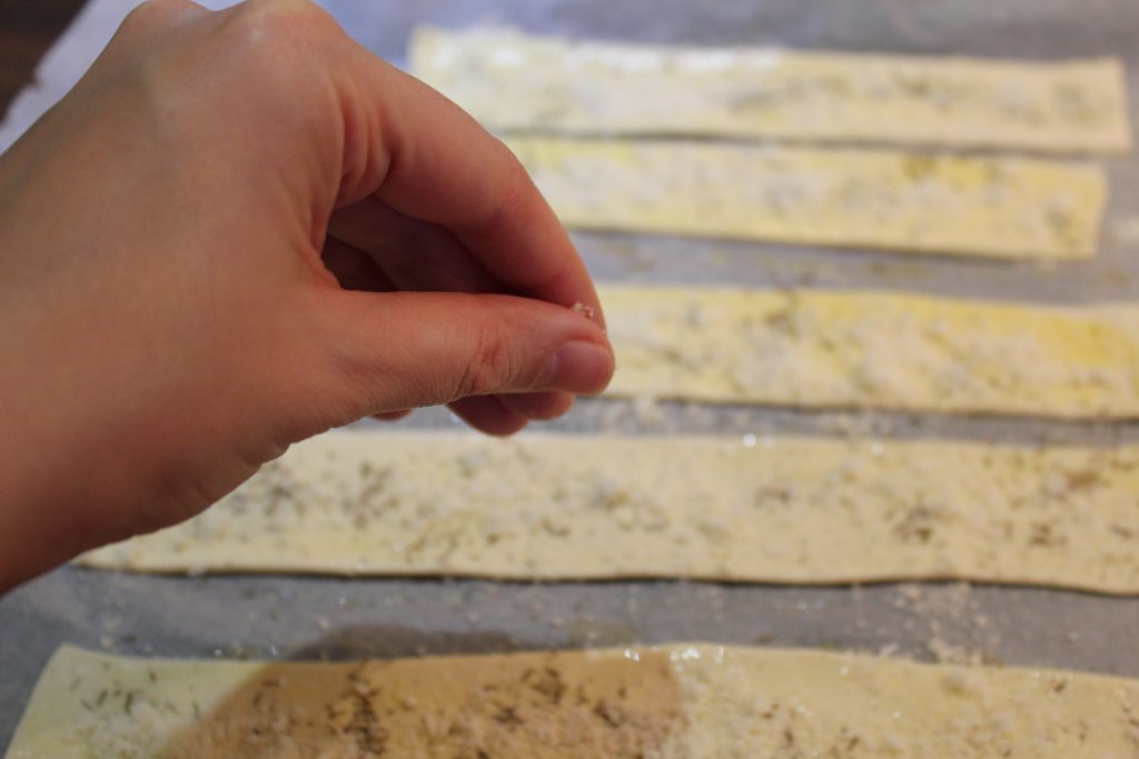 - Kauli levyt hieman ohuemmiksi ja leikkaa kaulittu levy kahtia. Pane puolitetut levyt pellille leivinpaperiarkin päälle. Voitele levyt munalla ja ripota niiden päälle juustoraastetta, yrttiä ja hieman suolaa. Tartu levyn molempiin päihin ja pyöräytä toista päätä eteenpäin, toista taaksepäin. Näin levy kiertyy jengamaiseksi spiraaliksi. Nipistä kierteen päät kiinni, jotta leivonnainen pysyy uunissa paremmin kasassa.