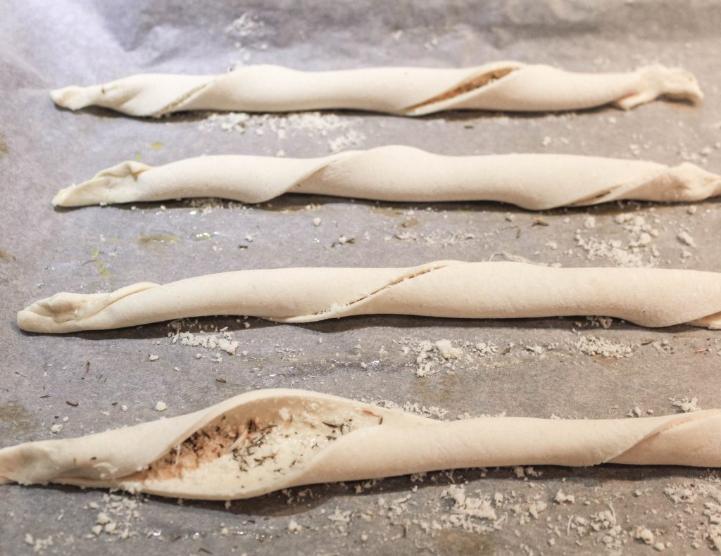 - Voitele vielä tankojen pinnat ja ripottele niiden päälle uusi kerros juustoraastetta, yrttiä ja suolaa. Voit hieroa tankoa varovasti leivinpaperiin, jotta sille valunut muna, juusto ja mausteet tarttuvat myös tangon pohjaan.