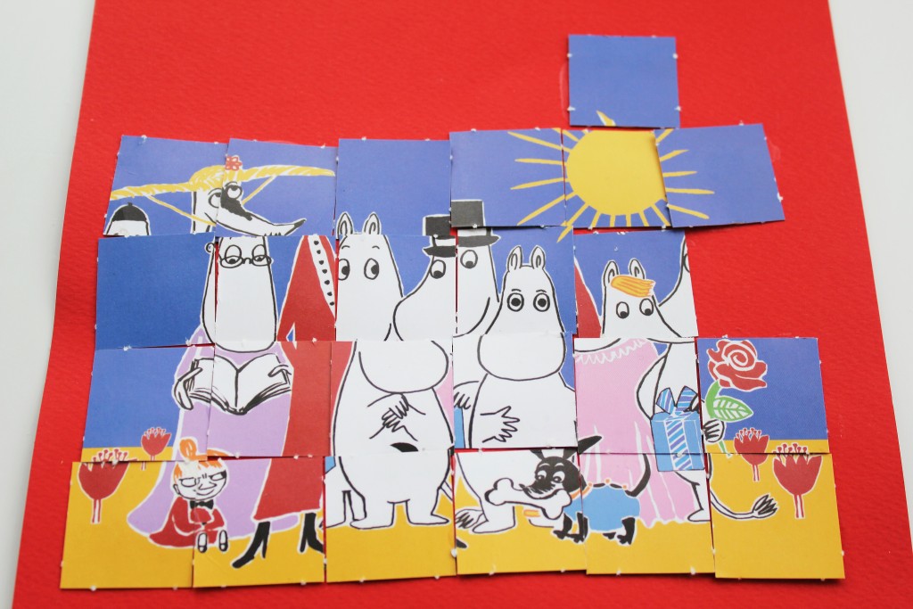 Ai mikä toi on? Kuulkaa se on tyttäreni joulukalenterista tullut Muumi-palapeli. Tarkoitukseni oli askarrella plikan kanssa siitä kortti miehelle yllätykseksi. No, tulihan siitä kortti. Omanlaisensa. Postasin kuvan Facebookiin ja riehuin, että osa paloista on kadonnut, koska Vilijonkan pää kasvaa jonkun mummun harteista, ja Niiskuneidin vartalo levitoi ties missä.