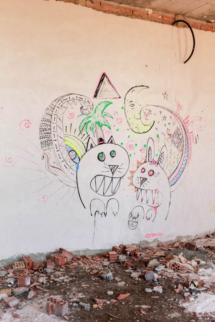 Meitä aikuisia kiinnosti myös se, miten hassuja asioita luonnosta tuli spottailtua. Löysimme metallinpalasia törröttävän, graffiteilla koristellun uudehkon talon raunion, jonka pihalla oli myös vanhoja kivenkappaleita. Miljöö oli kuin Twin Peaksin kolmoskaudelta.