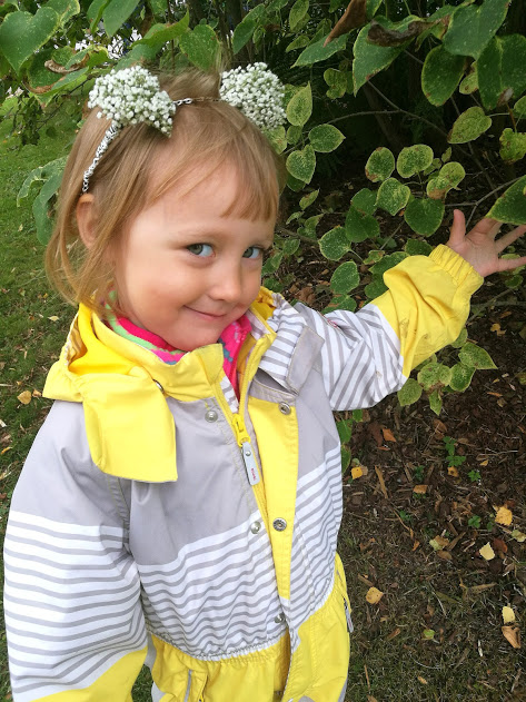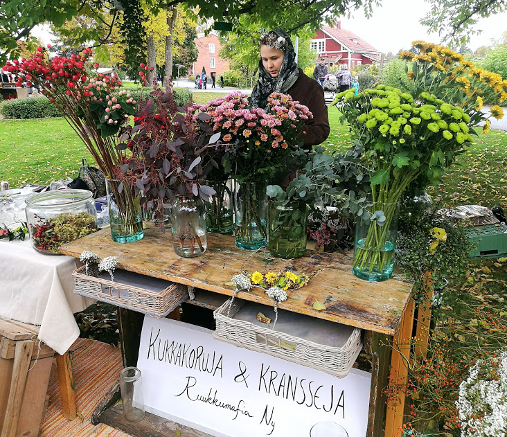 Ihastelimme myös floristiopiskelijoiden sitomia kimppuja ja seppeleitä, ja tyttönen halusi tuollaisen parin euron hintaisen kukkapannan. Jos tyyppi heittää tällaista keimailunaamaa, kuka voi kieltäytyä? En ainakaan minä. Oi voi. Olemme niin pulassa reilun kymmenen vuoden kuluttua.