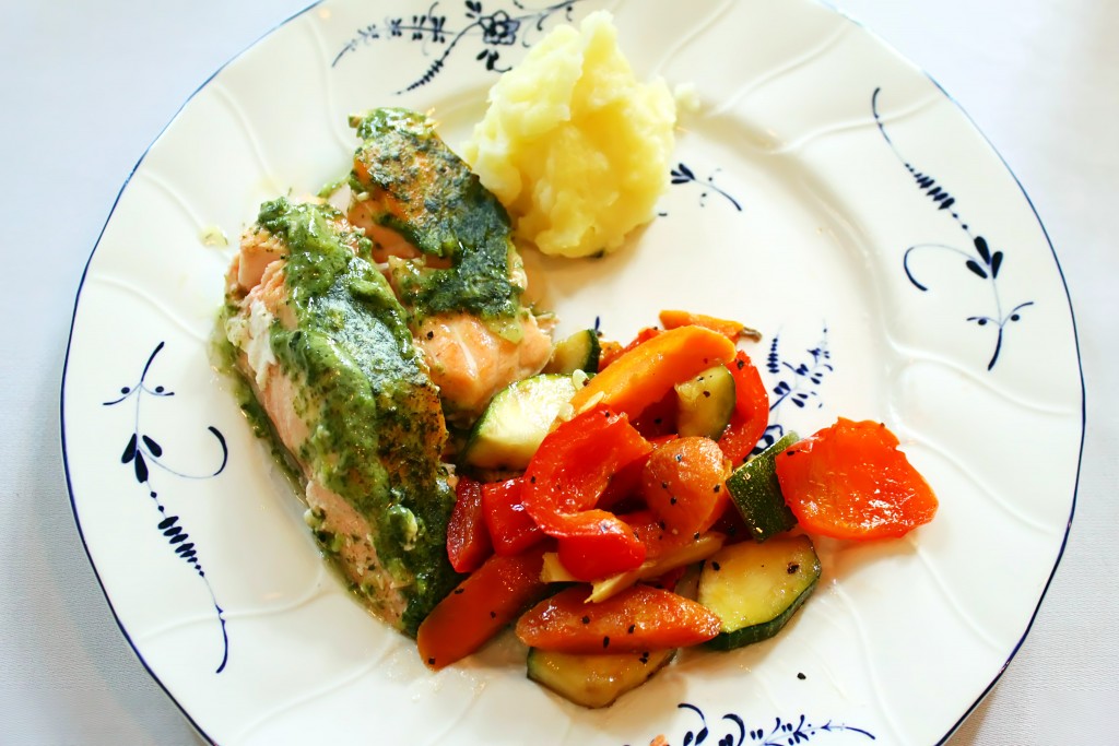 Pääruoaksi oli uunilohta ja muusia. Miljoonaan kertaa syöty, erittäin varman päälle pelattu ruokalaji, joka valitettavan usein pilataan liisterimäisellä pussimuusilla ja kuivaksi tikuksi kärvennetyllä kalalla. Ei nyt. Kaikki oli tehty niin hyvin, että jäin oikein ihastelemaan simppeliä annosta. Muusi oli tehty itse, siinä oli kunnolla makua ja samettinen rakenne. Ja lohi, se oli kypsennetty aivan täydellisesti, mikä on buffetpöydässä harvinaista. Kala lohkeili pehmeinä ja mehevinä palasina. Kerman sijaan se oli höystetty raikkaalla, hiukan kirpeällä yrttikastikkeella. Lisukkeeksi oli myös kuullotettuja kasviksia. Mums.