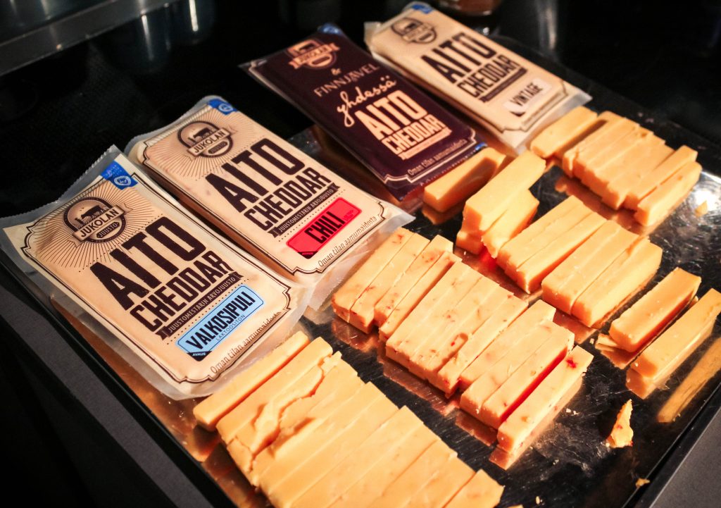 Sain itsenäisyyspäivän juhliimme sponsorilahjana valikoiman Jukolan Juuston cheddareita, jotka on tituleerattu Suomen parhaiksi. Niissä on intensiivinen maku ja kaunis väri. Pitkään kypsyneissä Finnjävel- ja Vintage-cheddareissa on kunnon kiteisyyttäkin.