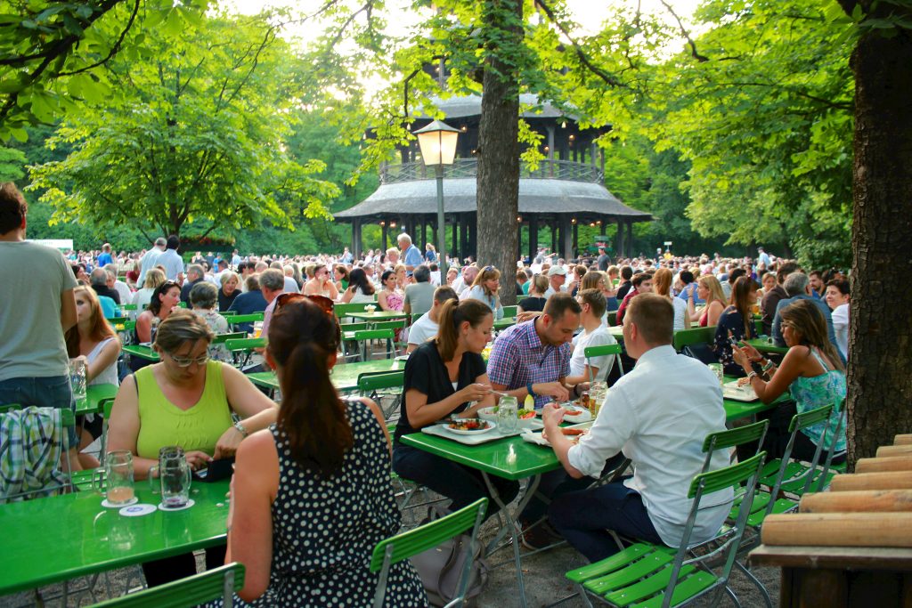 Seuraavana päivänä päätimme viettää Baijeri-illan. Suuntasimme englantilaiseen puutarhaan eli Englischer Garteniin ja sen suosituimpaan ja tunnetuimpaan biergarteniin, Chinesischer Turmiin. Englantilainen puutarha on valtava puistoalue kaupungin sydämessä. Siellä on niin oluttupia, ravintoloita, urheilukenttiä kuin metsäpolkujakin. Keskellä puistoa on lampi, jossa voi ymmärtääkseni soudella vuokraveneellä, ja lammella voi nähdä jopa surffaajia.