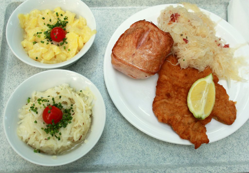 Maistelimme, öh, siis mätimme kulhollisen kirkasta peruna- ja kaalisalaattia. Lämpimistä ruoista valitsimme ohueksi nuijitun, leivitetyn schnitzelin sitruunan kera sekä paikallisen makkaranjöötin hapankaalin kera. Annoskoko oli valtava, mutta ruoan hinta oli taas vain noin 20 euroa sisältäen kaksi puolen litran tuopillista.