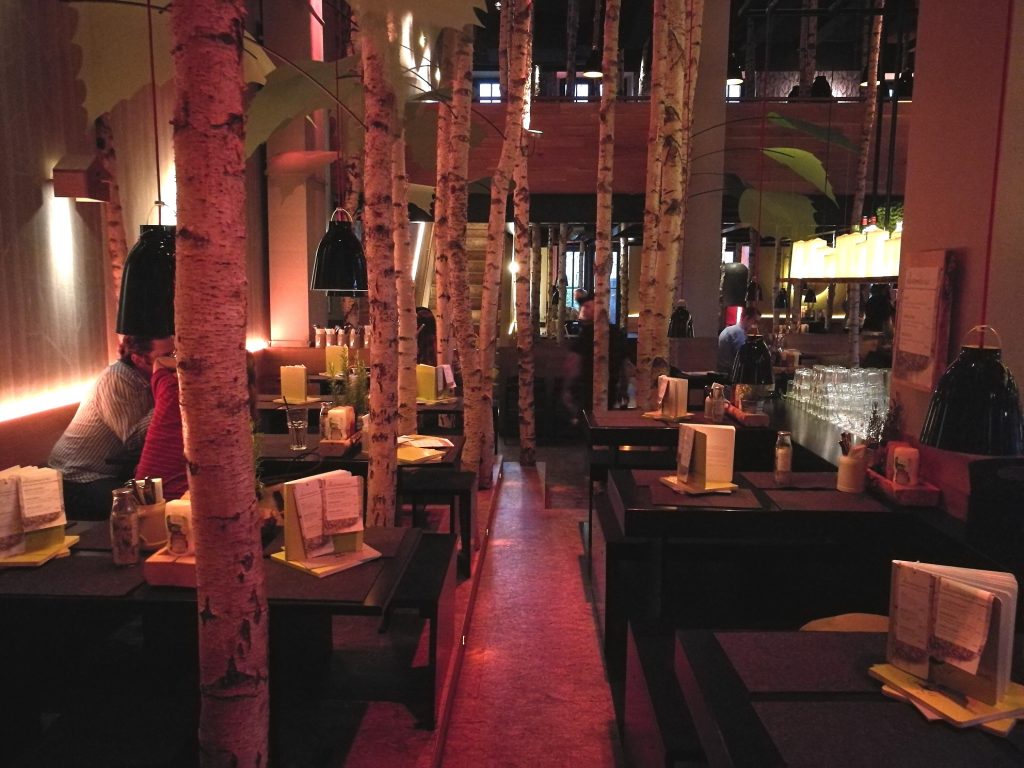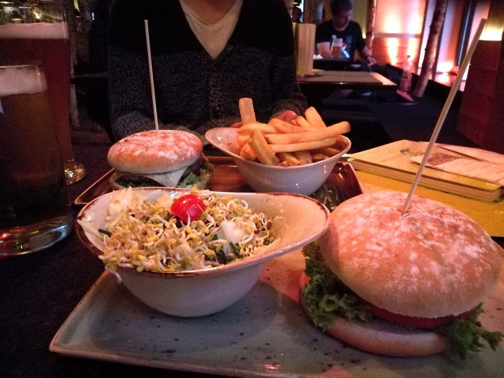 Tuloiltanamme kaipasimme jotain helppoa ja nopeaa. Siispä purilaiselle ja oluelle. Suuntasimme satumaiseksi hehkutettuun Hans im Glück -ravintolaan. Kyseessä on ketju, mutta sitä on vaikea uskoa. Vanhaan Onnellinen Hannu -kansansatuun pohjautuva konsepti nimittäin näkyy pienimmissäkin yksityiskohdissa. Jokainen ravintola on sisustettu satumetsäksi aidoilla koivuilla. Kävimme kaupungin päärautatieaseman kupeessa olevassa ravintolassa, joka on tehty vanhaan kirkkoon. Korkeaan, hämyiseen ravintolasaliin oli rakennettu jopa puumajoja tikkaineen.