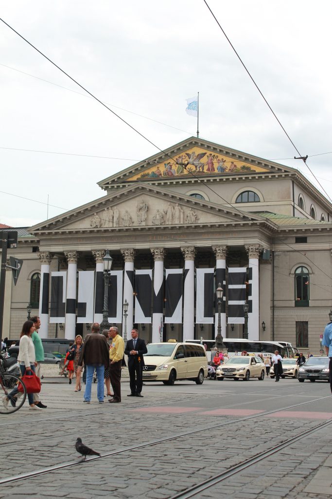 Valitettavasti leffamuseo oli elokuvafestivaalien vuoksi kiinni. Leffamuseon kahvila ja sisäpihan terassi olivat kuitenkin aivan ihanat. Kyllä kelpasi istuskella, nauttia cappucino ja pala sacherkakkua trooppisten puiden katveessa. Lisäksi museon kauppa on mahtava – jos pidät mäyräkoirista. Mäykky on yksi Baijerin kansalliseläimistä, ja uljaisiin nakkikoiriin liittyvää tavaraa löytyi olutkolpakoista lasinalusiin ja viivottimiin. Saatoin ostaa kaikki edellä mainitut…