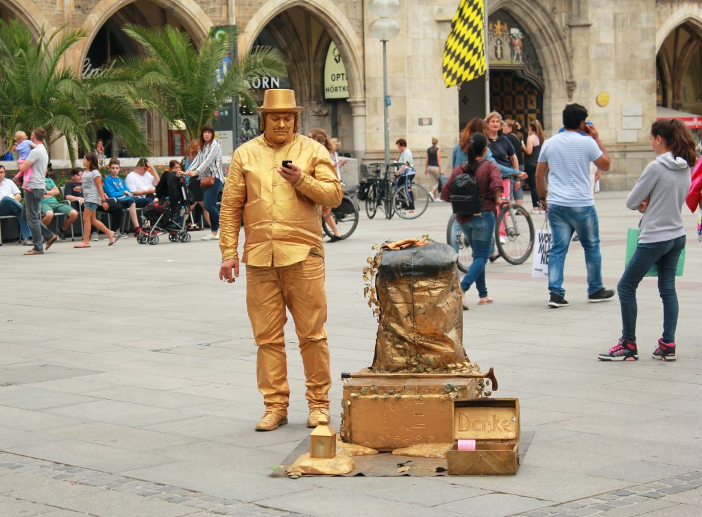 Bongasin Marienplatzin liepeiltä ehkä kyrsiintyneimmän miimikon evö. Setä veteli röökiä ja näpytti kännykkäänsä eikä edes vaivautunut leikkimään, että hei, mää oon oikeesti patsas, öhöhöö, ei kun kato, kato, mun kulmakarvat liikkuu, vai liikkuuko, no vittu anna euro.