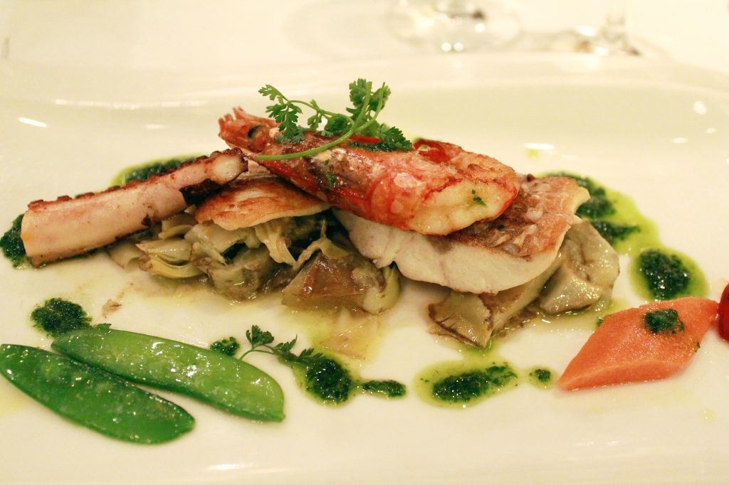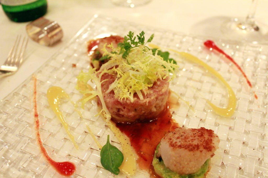 Aluksi meille tarjottiin tuoreita kesäkasviksia jääpalojen kera sekä talon leipää erilaisten levitteiden kanssa. Varsinainen alkutervehdys oli lohitartar. Minä jatkoin kalalinjalla, sillä ensimmäinen ruokalajini oli tonnikalatartar. Annos oli alkupalaksi hätkähdyttävän iso, sillä kyljessä oli vielä kampasimpukkaa ja avokadoakin. Tonnikala oli tuoretta ja juuri sopivasti maustettua, ja sitruuna- ja tomaattipyre kruunasivat elämyksen. Heti tämän annoksen jälkeen muistin, miksi Limoni lumosi meidät niin voimakkaasti vuosia sitten.
