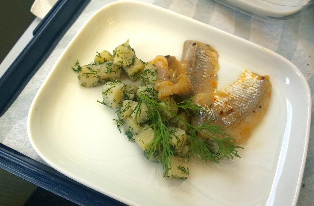 Ateria alkoi lupaavasti. Alkupalaksi tarjoiltiin tyrnimarinoitua silakkaa ja tilliperunoita. Posliinilautasilta tarjoiltu annos oli jopa niin kaunis, että se vastasi ravintolatasoa. Silakka oli maukas, mutta ei tönkkösuolattu. Perunoissa oli hyvä, napakka rakenne. Aterian koristeena oli tuore tillinvarsi.