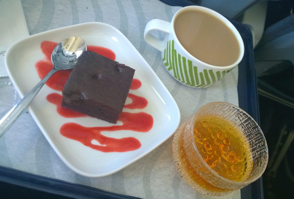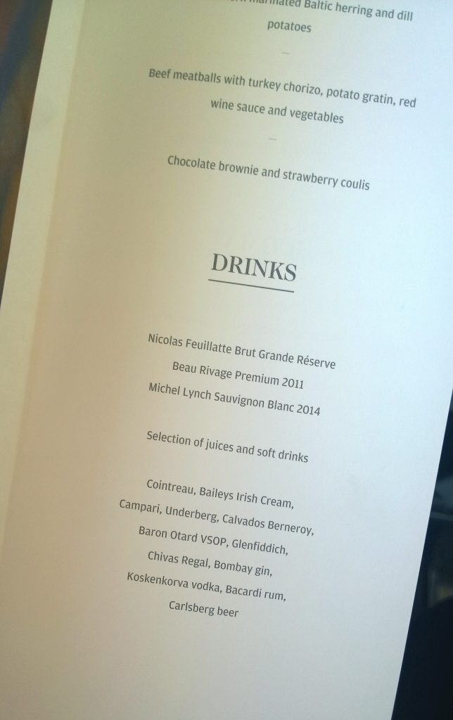 Tässä ateriassa ote tosiaan lipsui valitettavasti pääruoassa. Ja kun nyt mietin kokonaisuutta, niin reilut 20 euroa maksanut Thomas Cookin turistilennon safka ei tälle hävinnyt. Ja jos minä juon koneessa, mulle riittää yksi piccolo-pullo kuohuvaa ja senkin jaan usein miehen kanssa. Lärvit, turvotus ja kropan kuivuminen on kamalin yhdistelmä, minkä voin tällaisena herkästi pahoinvoivana ihmisenä kuvitella, joten ilmainen viina ei kauheasti houkuta.