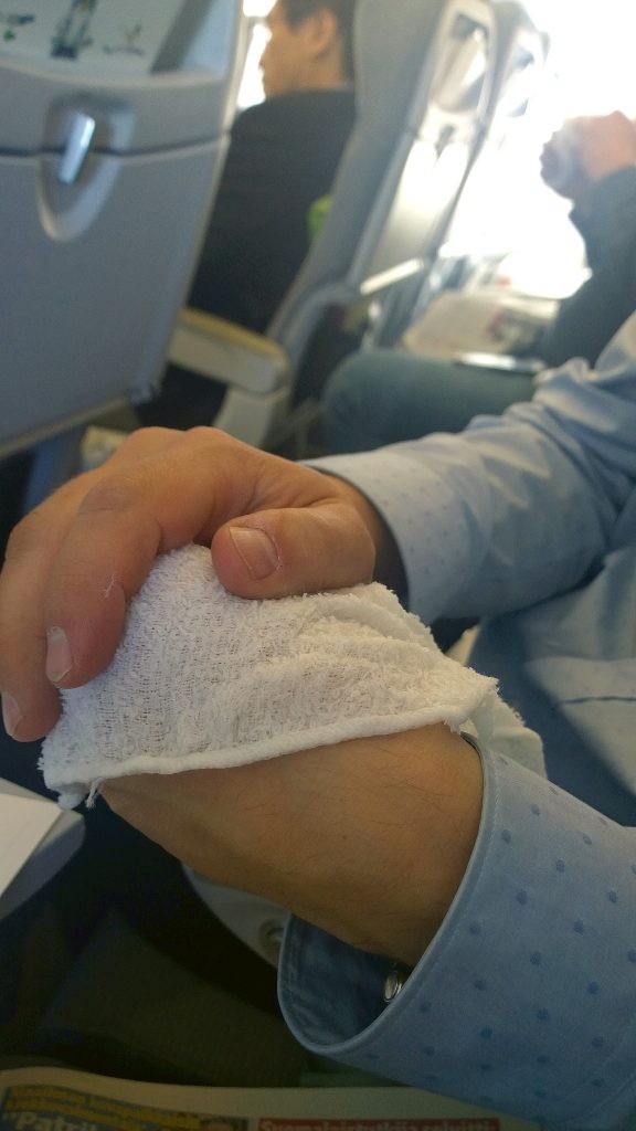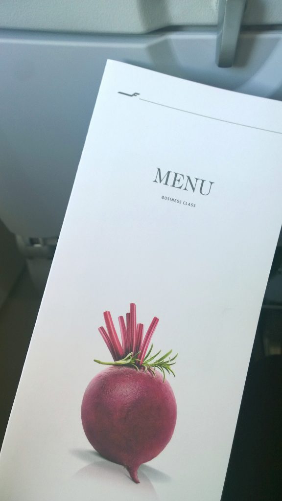 Kaikkein eniten minua kiinnosti tietenkin ruoka. Lentoyhtiöt ovat yrittäneet parantaa parjatun, maksulliseksi muuttuneet lentokoneruoan tasoa. Finnair on käyttänyt business-luokan menuiden suunnittelussa apuna Kari Aihista. Ennen ruoan tarjoilua matkustajille jaetaan menut ja viinilistat, mikä tuo ateriointiin ravintolamaista fiilistä. Luksuksen tuntua tuo lämmin kostea pyyhe, jolla kätensä voi puhdistaa ennen ruokailua.