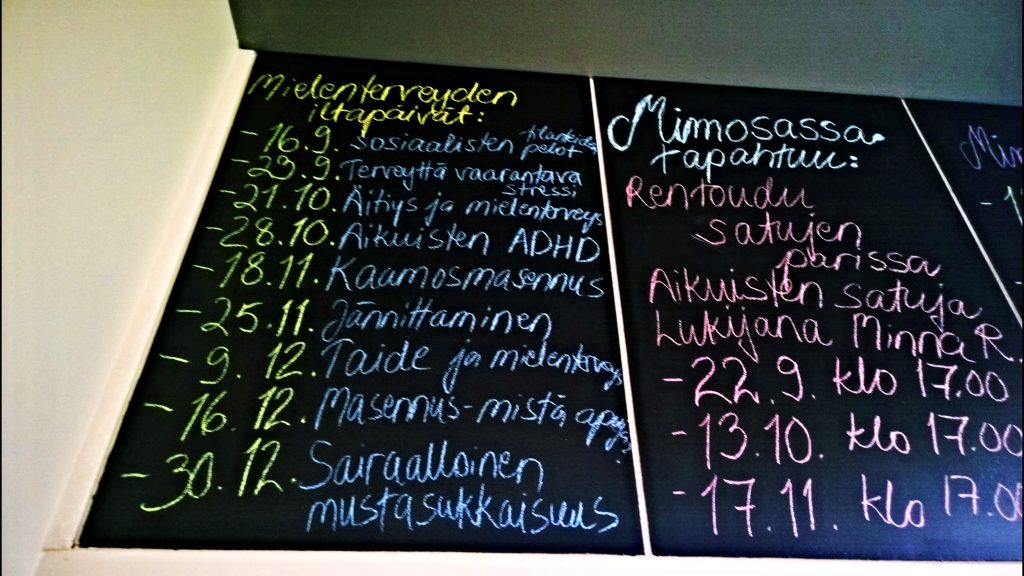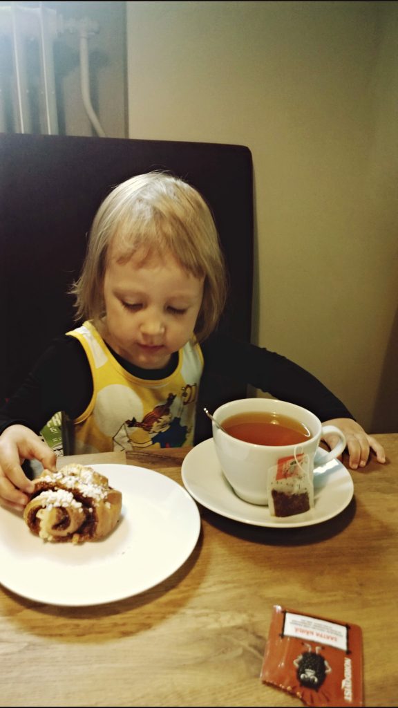 Minulle tuli erityisen lämmin fiilis, kun kävimme Mimosassa kaverini ja lastemme kanssa. Tytöt lueskelivat Aku Ankkoja mussuttaessaan pullaa. Minun plikkani kastoi nisuaan Muumi-rooibosteehen. Oli kuulkaa suklaapirtelön makuista Haisuli-flavouria kupissa. Mimosan ohi kävellessämme tyttö sanoo, että ”tossa on kiva kahvila”. Ja minulle tulee sellainen olo, että tämä on meidän paikkamme, juuri meidän erityinen paikkamme, jossa jaamme salahetkemme. Katsomme toisiamme merkitsevästi teekuppien ylitse ja hän hymyilee, kun nyppäisen sokerirakeen hänen pullealta poskeltaan.