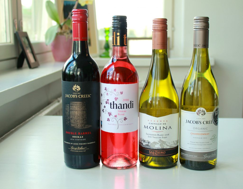 Juomavinkin live-tastingin viinit ovat Alkon edullisia ja keskihintaisia viinejä: Jacob’s Creek Organic Chardonnay (9,99 e), Castillo de Molina Reserva Sauvignon Blanc (10,79 e), Thandi Shiraz Rosé (8,99) ja Jacob’s Creek Double Barrel (17,99). Jos hankit yhden pullon jokaista viiniä, setti maksaa yhteensä alle 50 euroa. Viiden kaverin poppoossa tastingille tulee halvimmillaan hintaa 10 euroa per osallistuja, ellei ruokakuluja lasketa mukaan.