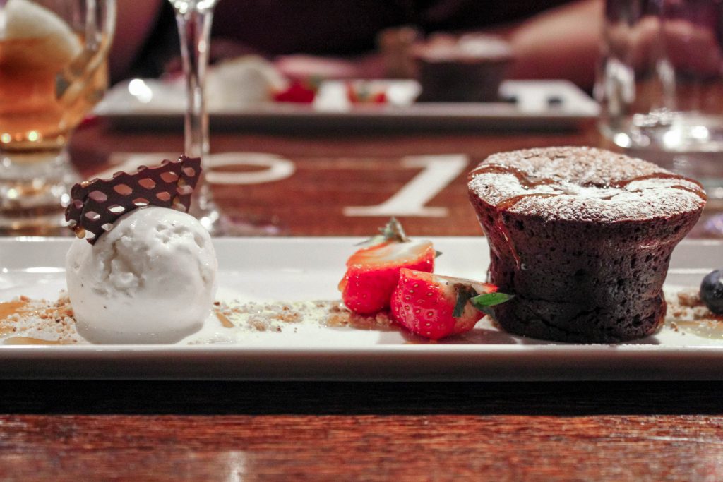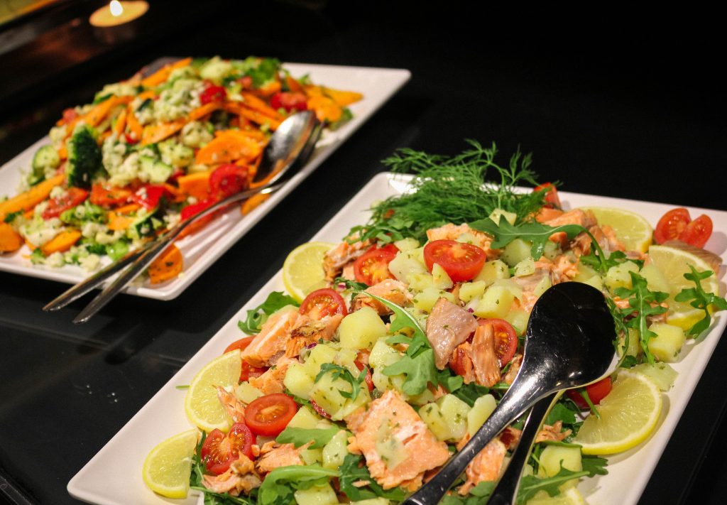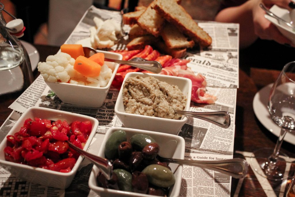 Alkupaloiksi tarjottiin muun muassa uunituoretta valkosipulileipää, munakoisopestoa, marinoituja kasviksia, leikkeleitä ja buffalomozzarellaa. Pääruoaksi söimme parmesaanirisottoa, kokonaisia paahdettuja valkosipuleita, grillattua mustekalaa, kananpojanrintaa, pihvihärkää ja marsalakastiketta, jälkkäriksi suklaakakkua ja jäätelöä.