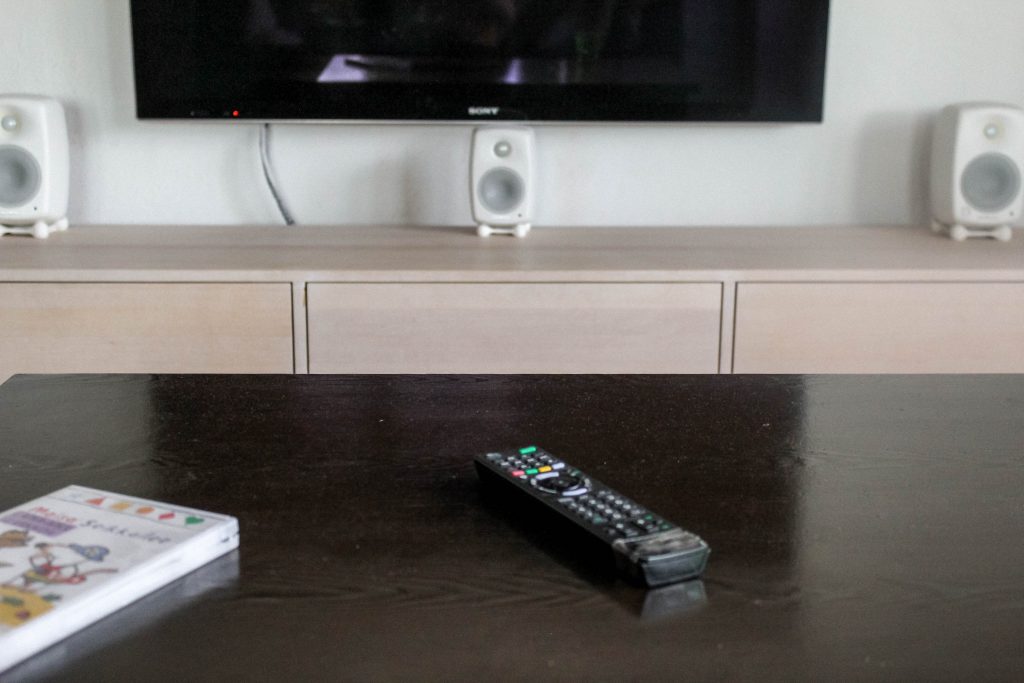 Ajjjajjaj kun tekee pahaa! Vinohko horisontti, kiiltelevästä pinnasta erottuva pölyputu, keskimmäisen kaiuttimen selvä vinous viereisiin, kaiuttimien muotokielen ristiriita television, pöydän, kaukosäätimen ja kirjan kanssa. Pöydän, kaukon ja kirjan epäsuhtainen asento toisiinsa nähden.