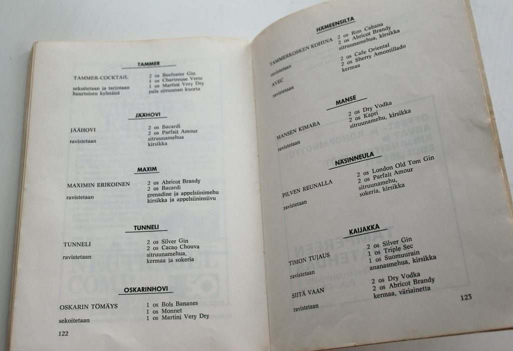 Kirjassa on myös kokonainen juomille pyhitetty osio. Kaikki kaupungin tunnetuimmat baarit ja yökerhot ovat saaneet nimikkodrinkkinsä. Jäähovi-coctailiin tulee Bacardia ja Parfait Amouria, Näsinneulaan London Old Tom Giniä ja Parfait Amouria.