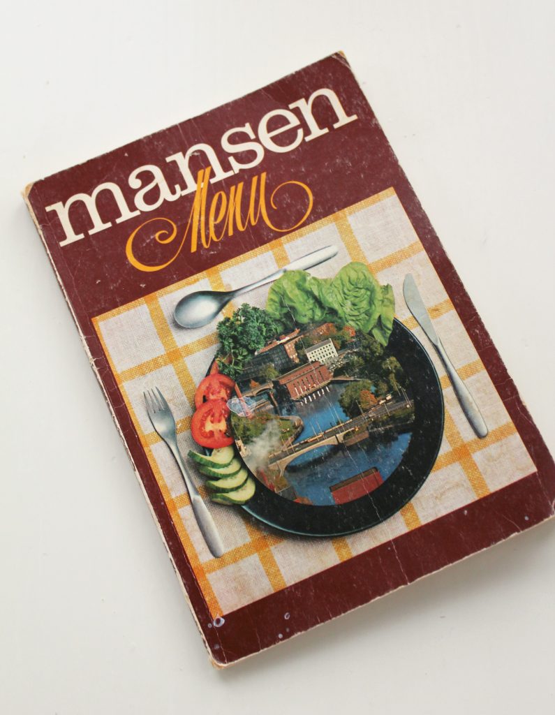 Kävimme vappuna drinksuilla naapureiden luona ja huomasin heidän kirjahyllyssään hauskan opuksen. Mansen menu -niminen kirja on vuodelta 1973, ja sen on kustantanut Kaarilan Lions Club.