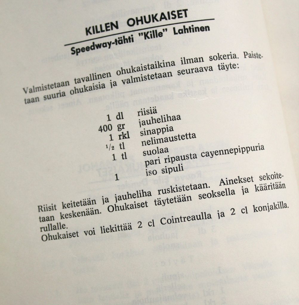 Vai väitätkö, että nämä Speedway-tähti Kille Lahtisen ohukaiset eivät saa kuolaa valumaan suupielestäsi? Eikö Aamulehden päätoimittaja Raino Vehmaan viettelevästi nimetty möskäpäta houkuta? Kamoon, konjakki, Cointreau, valkopippuri, kerma, sinappi, nelimauste, liekitys, grrr……