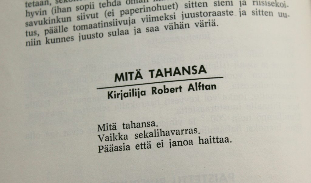 Kirjailija Robert Alftanin ruokafilosofia on yksinkertaisuudessaan lähes zeniläinen. Tärkeintä on se, ettei ruoka häiritse juomapuolta.