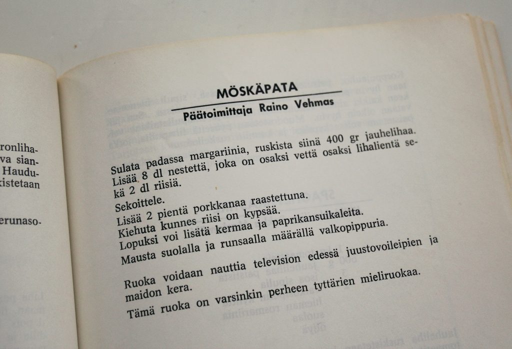 Myös lihaliemikuutiot, maustepippuri ja nelimauste ovat suosittuja höysteitä. Nelimauste koostuu siis neilikasta, muskotista, pippurista ja inkivääristä. Minäkin käytän noita mausteita omassa keittiössäni, en tosin valmiina seoksena. En myöskään ropsi voimakkaita ja jouluisia makuja yhtä huolettomasti sinne sun tänne kuin 70-luvun herkkusuut.