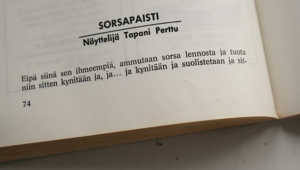 Resepteistä päätellen kokit ovat marinoineet likööreillä paitsi ruoan, myös itsensä. Näyttelijä Tapani Perttu haluaisi kovasti jakaa herkullisen sorsapaistin reseptin, mutta ohjeen mieleen palauttaminen tuottaa Pertulle kovasti vaikeuksia.