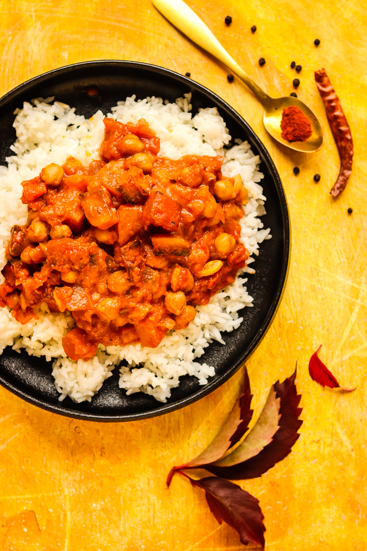 Proteiinia myskikurpitsacurry saa kikherneistä. Sipulin lisäksi kastikkeessa ei ole muita kasviksia, mutta niitä voi toki lisätä. Veikkaan, että esimerkiksi munakoiso sopisi hyvin kurpitsacurryn makumaailmaan.