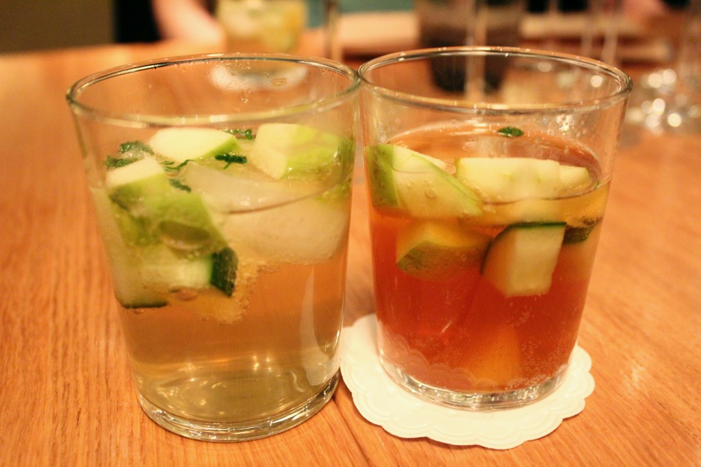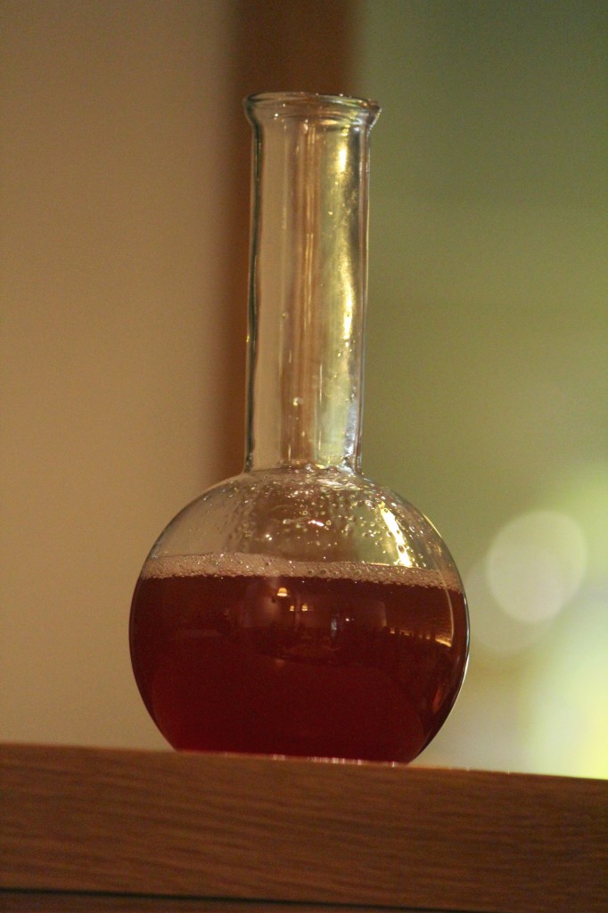 Hämmennyin niin, että kuvan ottaminen unohtui, enkä todellakaan muista, tarjottiinko suunraikastajankin kanssa jotain juotavaa. Alkoholittoman menun tilanneille kaadettiin jossain vaiheessa hennon makuista jääteetä dekantterista, joka muistutti hullun kemistin pulloa. Ehkä. Ainakin tällaisen kuvan olen ottanut. Ja jossain pöydässä joku tilasi uuden kierroksen absinttia. Tällä kertaa raakana. Muistikuvat sumenevat. Löysin naisten vessasta vaaleanpunaisen Barbababan. Miesten vessassa oli kuulemma musta samanlainen…