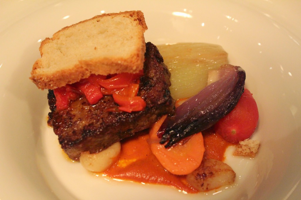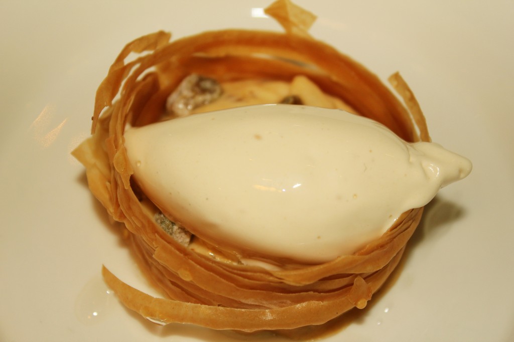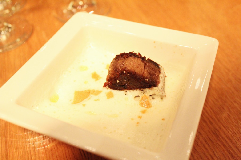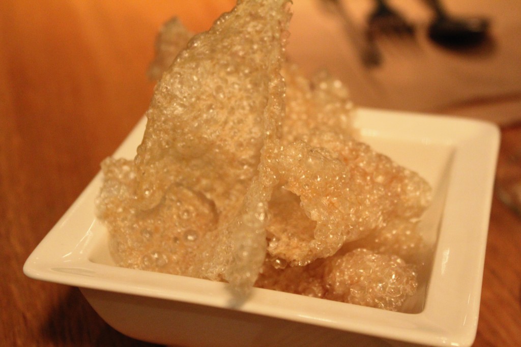Ranskan itäosia lähestyttäessä myös ruoka muuttuu tuhdimmaksi. Toinen alkupala oli melkoinen yllätys: siannahkasipsejä. Pasi Mamia kertoi, että sipsit oli vuoltu todella ohuesta nahasta, niitä oli kuivattu pitkään uunissa ja tämän jälkeen vielä friteerattu. Sipsit olivat enemmänkin molekyyligastronomiaa kuin makujen ilotulitusta. Niistä tulivat mieleen maustamattomat maissinaksut, joita syötetään pikkuvauvoille ja taaperoille. En olisi ikinä arvannut, mistä raaka-aineesta sipsit oli tehty. Mauttomuus kuitenkin häiristi, vaikka rakenne oli riemastuttava. Sipsit olisivat kaivanneet joko reilummin mausteita tai dippikastikkeen.