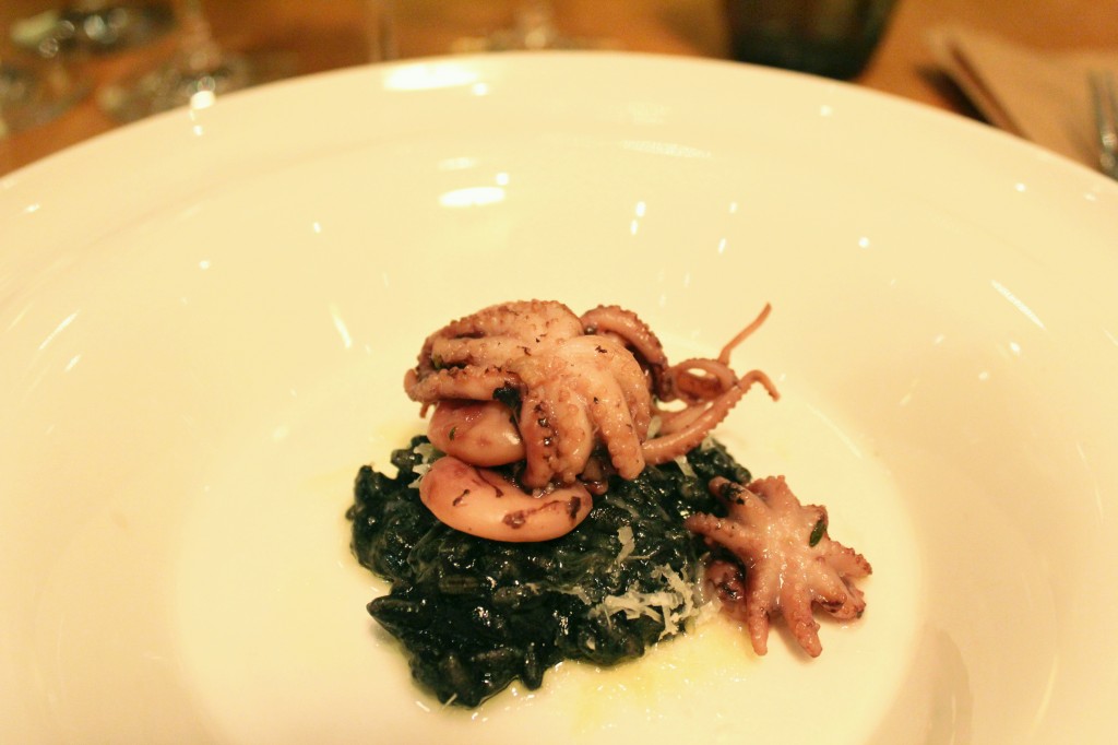 Tämän huippukokemuksen jälkeen jännitti. Juna puksutti Pohjois-Italiaan, ja kuola alkoi valua. Ajattelin ihania pohjoisitalialaisia liharuokia, patoja, tuhteja risottoja. Konduktöörimme laulukin vihjaisi, että tiedossa on riisiruokaa. Odotin häränhännän jatkoksi jotain tuhtia ja kermaista. Yllätyin, kun ruokasaliin leijailikin merellinen tuoksu. Vuorossa oli ruokalaji, joka jakoi seurueemme mielipiteet jyrkästi kahtia: mustekalaa musteella maustetun risoton kanssa.