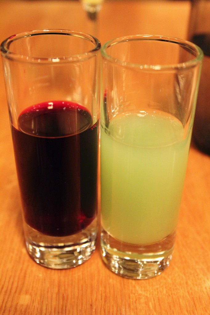Tässä vaiheessa iltaa tunnelma alkoi olla aika hilpeä. Moni seurue tilaili magnum-koon samppanjapulloja aterioiden välillä. Hiukan hysteeriseen meininkiin sopikin hyvin välishottina tarjoiltu absintti eli maaginen koiruoho. Absinttia ei tosin tarjoiltu raakana, vaan sitä oli laimennettu. Alkoholiton shotti oli tymäkkä punajuurimehu. Koeputkia muistuttavat vihreät ja verenpunaiset drinksut toivat elävästi mieleen itäisen Etelä-Euroopan tunnelman.