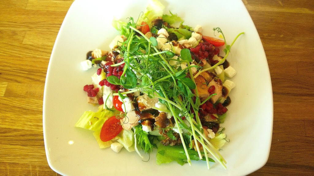 Hämmästyin, kun salaatti olikin raikas. Juusto oli murusteltu kanan päälle, ja sitä oli juuri sopivasti pieninä suolaisina sattumina. Broileri oli taas mukavan pehmeää, ja makea balsamico ja granaattiomenan kirpeys tekivät kombosta tasapainoisen. Vaikka salaatti on pari euroa kalliimpi kuin monessa muussa paikassa, maksoin tästä ihan mielelläni.