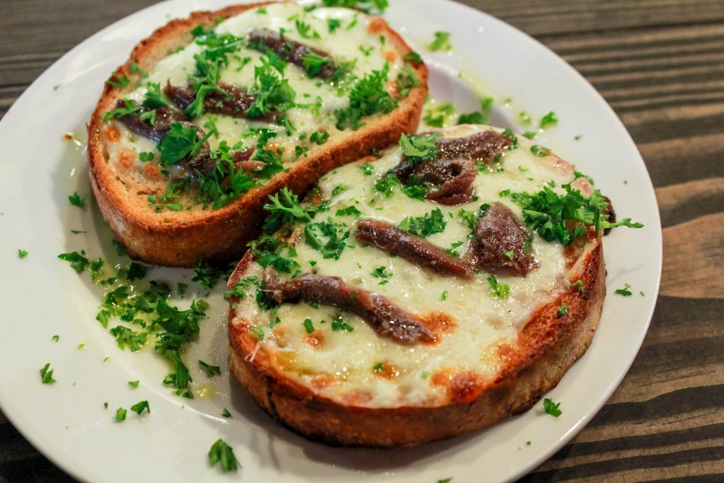 Juusto oli selvästi laadukasta; kiinteää, mutta pehmeästi venyvää. Leivän grillausaste oli erinomainen, ja sardellit ihanan suolaisia, mutta raikkaita. Tämä on tärkeää, sillä tympeimmillään kehno säilysardelli on maultaan rasvasillimäinen eikä pysy koossa. Nämä pikkukalat olivat napakoita ja kauniita. Loistava suolapala, joka herätteli ruokahalua.