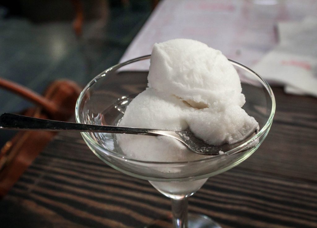 Nutella-pizzaa maistoin jo Pizzariumissa, ja koska mieleni teki jotain raikasta, tilasin vegaanijäätelön. Nyt listalla oli vain yksi vaihtoehto, cava-sorbetti. Se sopi meikäläiselle enemmän kuin hyvin. Heitimme vitsiä siitä, että italialaisessa raflassa pitäisi olla prosecco-jäätelöä, mutta kaikki maistoivat hanakasti tätäkin. Alkoholin maku ei tunkenut häiritsevästi läpi, vaan sorbetti oli sopivan makea ja kevyt. Jokin pieni koriste, kuten pari basilikanlehteä, olisivat tehneet jäätelöstä vielä viimeistellymmän ravintola-annoksen.