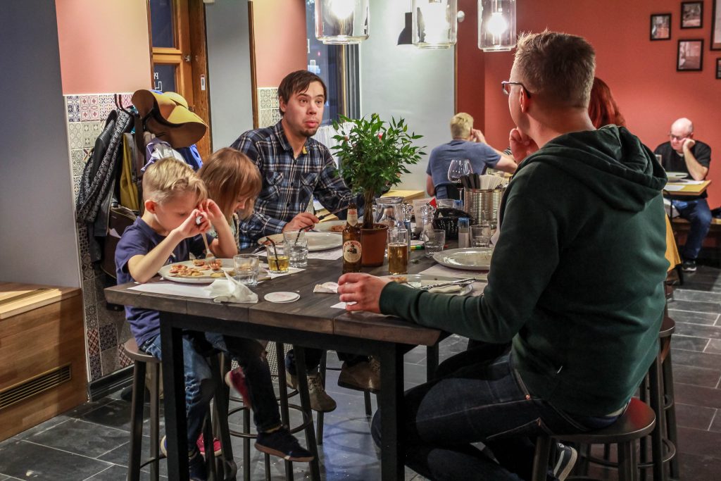 Saimme pitkän, korkean pöydän keskeltä salia. Tilaa oli hyvin, mutta baarijakkarat olivat lasten kanssa hieman hankalia. Naperot nauliutuivat onneksi paikalleen, sillä tarjoilijalla oli pelisilmää. Hän toi pikkukavereille väritystehtävät ja kynät heti, kun natina ja venkoilu alkoi. Palvelussa oli muutenkin sitä pientä jutustelua, jota Suomessa kaipaan.