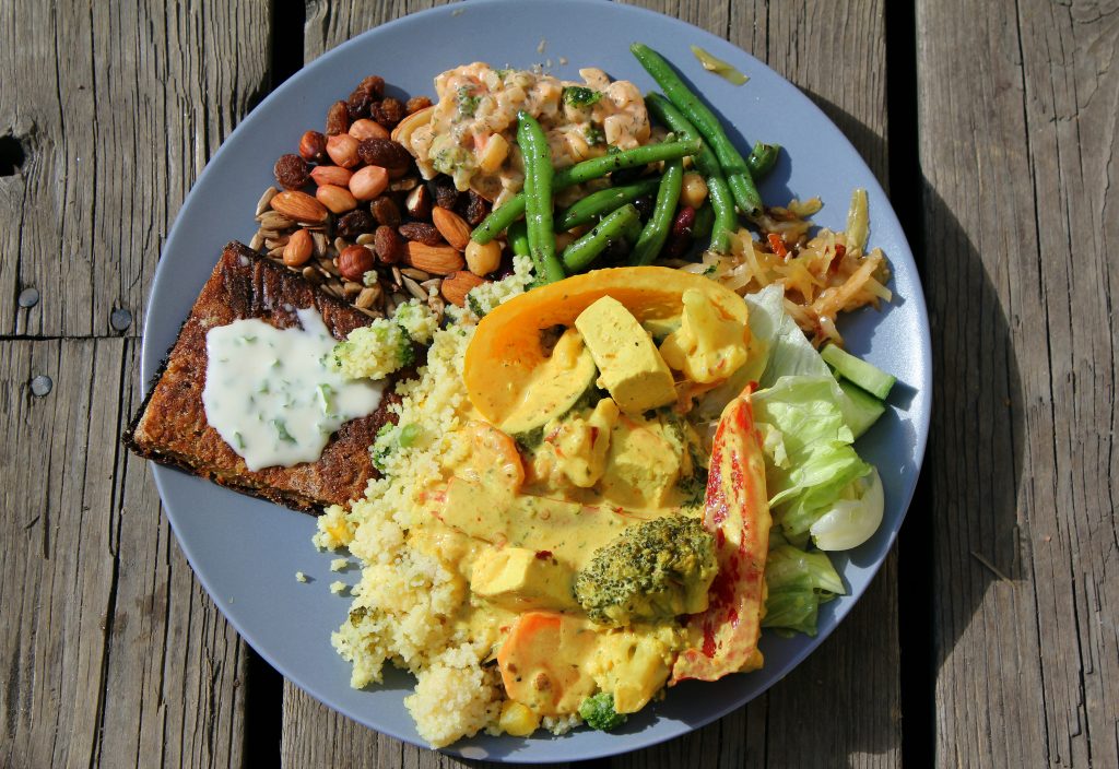 Frantsilan ruoka on minun makuuni, koska se on hieman intialaishenkisesti maustettua, eikä mausteiden kanssa arkailla. Parin lämpimän ruoan lisäksi tarjolla on useita salaatteja, kastikkeita, siemeniä, pähkinöitä, itse leivottua leipää ja levitteitä. Suosittelen testaamaan ihanan pehmeitä juuresleipäsiä. Sekä salaateissa että pääruoissa on riittävästi proteiinia eli nälkä lähtee varmasti. Jälkiruoka ja kahvi/tee kuuluvat myös pakettiin. Jälkkäri on ollut useimmiten marjakiisseliä kerma- tai soijavaahdolla.