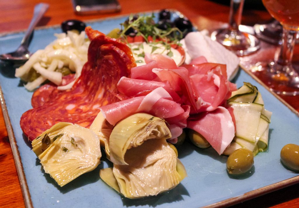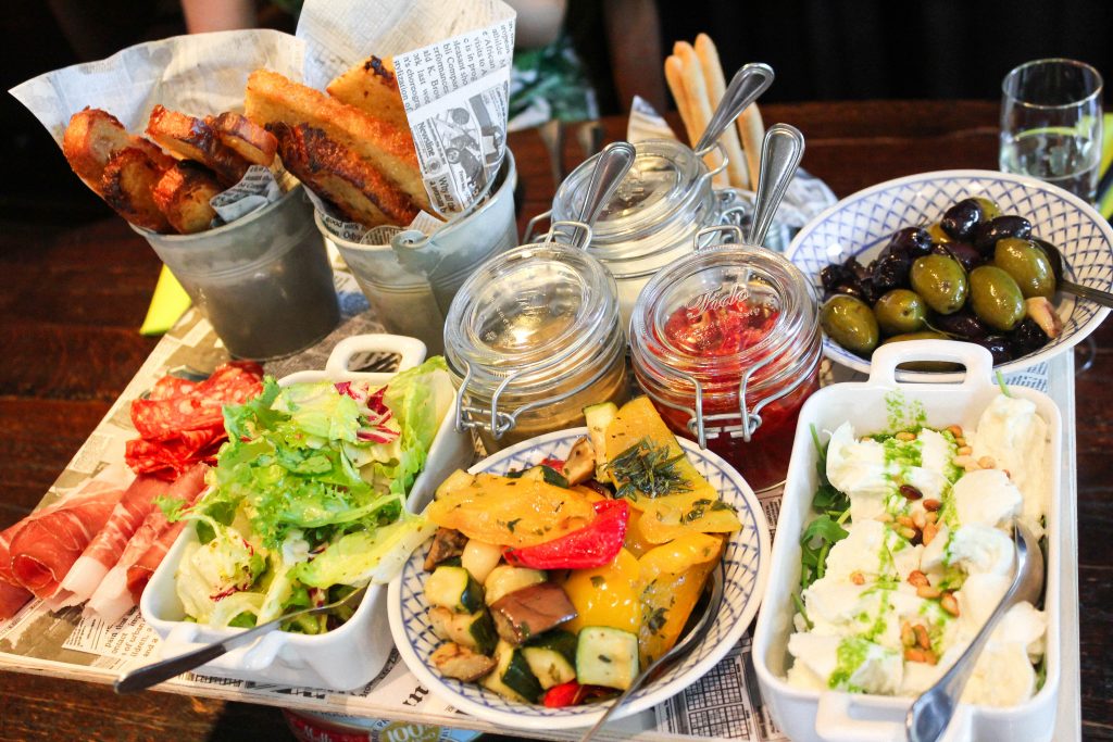 Nyt maistelimme porukalla sekä alku-, pää- että jälkiruokalajitelman. Tämä oli hyvä vaihtoehto, sillä olen armottoman annoskateellinen. Alkupalalautanen oli makuuni aikas täydellinen. Ihania rosmariinikasviksia, munakoisopestoa ja laadukasta mozzarellaa. Pääruokalajitelman lihat olivat taas nappisuorituksia: broitsu mehevää ja naudan sisäpaisti täydellisen mediumia. Parsarisoton maku oli hyvä, mutta koostumus olisi saanut olla napakampi. Jättiravut ja marsalakastike hurmasivat kaikki, mutta mielestämme viherpippurikastike huusi reilusti enemmän pippuria.