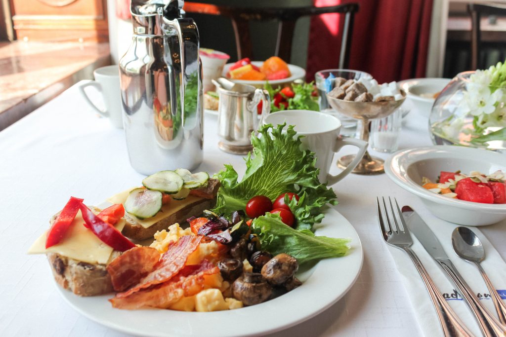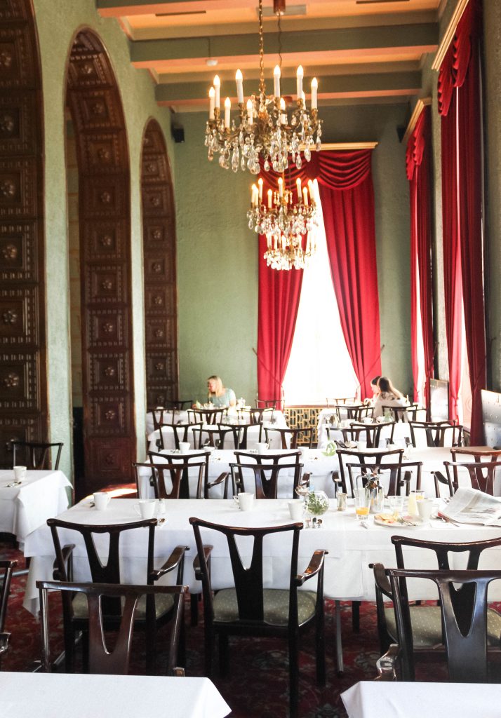 Tammerin aamiaissali on liioittelematta Tampereen upein. Usein hotellissa aamupalalle meneminen ärsyttää minua. Jonot, hallimainen ympäristö ja heti arkivaatteisiin pukeutuminen eivät hotsita tällaista kärttyisää heräilijää. Mutta kun ympärillä on lattiasta kattoon yltävät valtavat ikkunat, punaiset verhot ja vanhat pöytähopeat, itsensä on helpompi kingetä sängystä ylös.