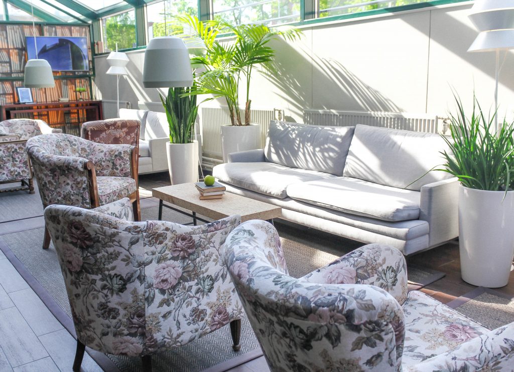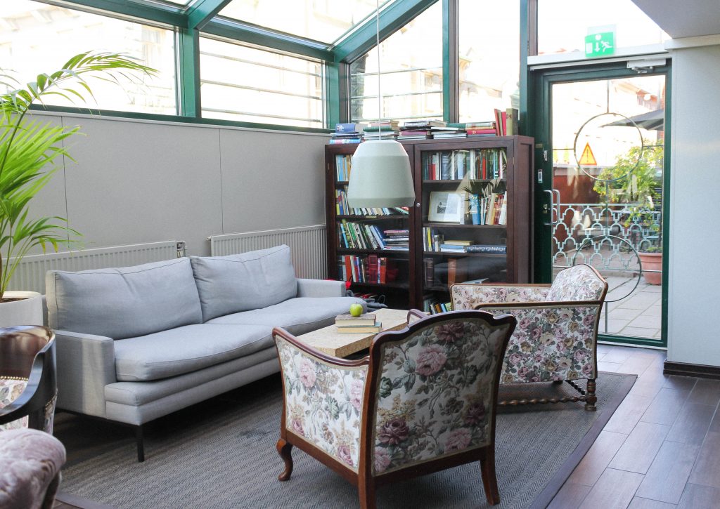 Kesällä taas loistavat Tammerin terassi puistoineen ja talvipuutarhha Vihtorin Veranta. Nimestään huolimatta Vihtori nimen omaan kesäpaikka. Hotellin pohjoispuolelle tehty oleskelutila kylpee valossa. Istuimmekin täällä Marikan kanssa pitkän tovin kuuntelemassa musiikkia, juttelemassa ja nautiskelemassa rauhasta. Vihtoriin voi ottaa mukaan drinkin ja heittäytyä sohvalle lueskelemaan; hyllyt ovat täynnä kirjoja.