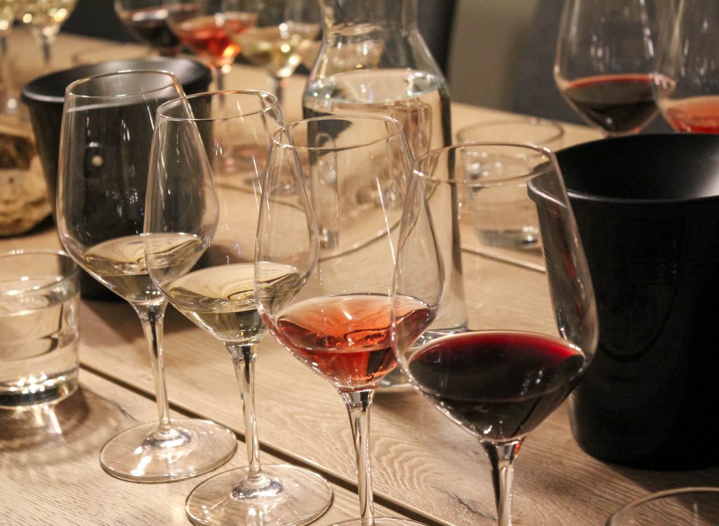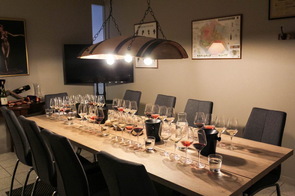 Ravintolasalin lisäksi Winebridgen takahuoneessa on isot tilat koulutuksiin ja tapahtumiin sekä kabinetti, jossa tastingimme järjestettiin. Maistelimme yllä olevassa kuvassa näkyvät viinit. Tarjolla oli siis koko värikavalkadi. En kuitenkaan analysoi viinejä sen enempää, sillä en tehnyt illan aikana muistiinpanoja, vaan keskityin hyvään seuraan, keskusteluun ja Timo Jokisen tarinoihin.
