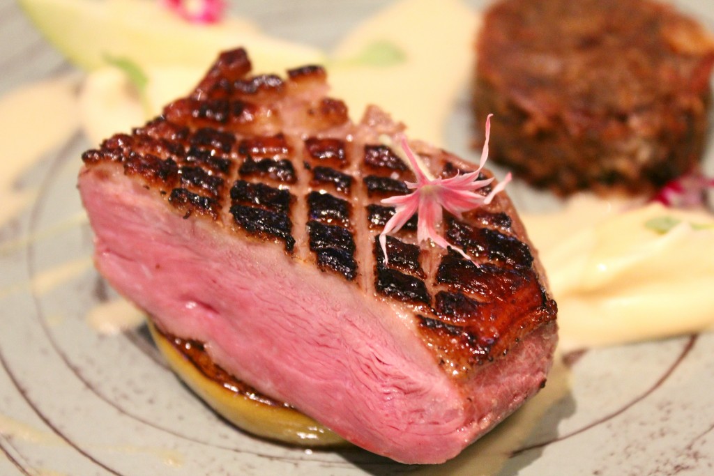 Pääruoka oli Näsinneulan kalan ohella illan hienoin. Meille tarkoiltiin ankkaa sekä rillettenä että paahdettuna rintana. Molemmat versiot olivat mehukkaita ja pehmeitä. Lisukkeena oli palsternakkapyrettä, savustetua omenaa ja kuminalla maustettua omenasalaattia. Tasapainoinen yhdistelmä savua, raikkautta ja täyteläisyyttä. Tuhti Dittelsheimerin Spätburgunder tuki ankkaa hyvin, eikä se ollut ristiriidassa raikkaan omenan kanssa, vaikka niin voisi luulla.