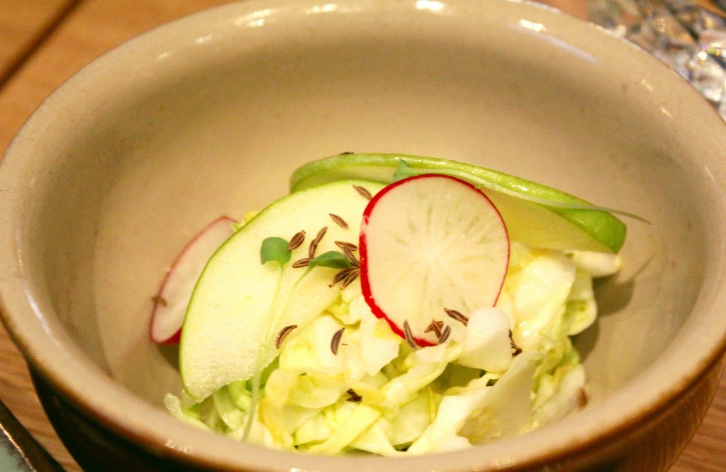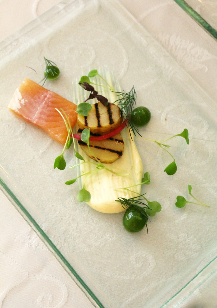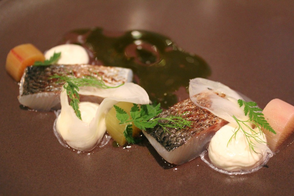 Varsinaisena alkuruokana tarjoiltiin siikaa, pikkelöityä raparperia, raparperilientä, ranskankermaa, fenkolinsiemeniä ja fenkolia. Viininä oli puolikuiva J. Bäumer Organic Riesling. Viinin maussa oli vihreää omenaa ja hieman limeä. Annos oli Dabbalin alkupalan ohella illan happamin – hienoa! Viini ja ruoka sopivat hyvin yhteen. Kala ja annoksen kaikki komponentit oli kypsennetty täydellisesti, ja paahdetut siemenet olivat mukavan rapeita. Annos oli kaunis hopeanroosa. Olisin kaivannut vain ripausta suolaista tai makeaa tuomaan pientä kontrastia happamuuteen.