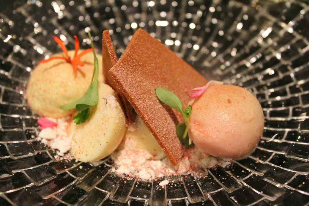 Väliruoaksi saimme suloisen seljankukkasorbetin, jonka joukkoon lorautettiin Markus Molieren kuohuvaa Rieslingiä. Yhdistelmä oli hienostunut ja raikas, ja oli hauskaa, että yksi viini tarjottiin tällä tavalla.